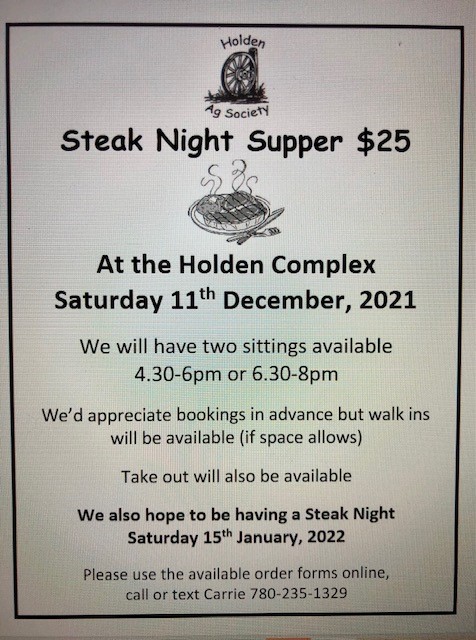 For the December steak supper, we again will be following provinical protocol and will be asking for proof of vaccination or negative test for dining in. If you want to do take out, we can do that too.
